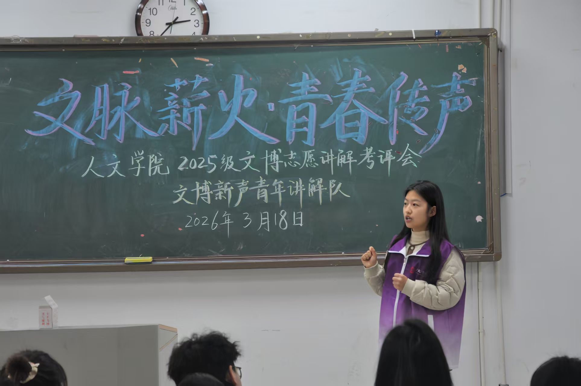 为进一步提升文博新声青年讲解队综合素养,促进队员之间的经验交流与风格互鉴,我院于3月18日下午2:00在图教楼B205开展了2025级文博志愿讲解考评会。本次活动由讲解队负责人杨依诺主持,党委副书记董宇老师、学工部主任童明明老师以及2025级全体文博新声青年讲解队队员及骨干成员参加了此次大会。